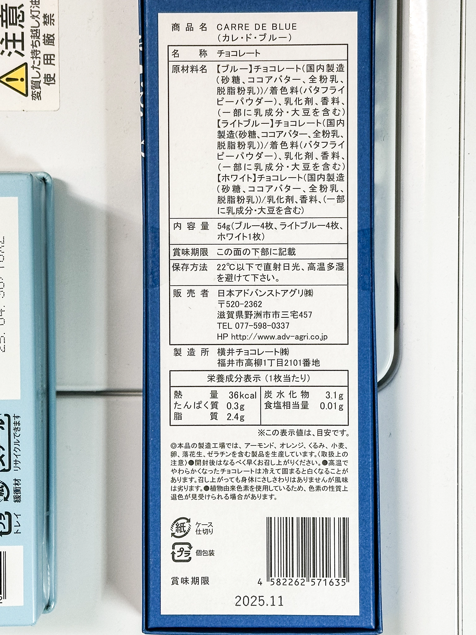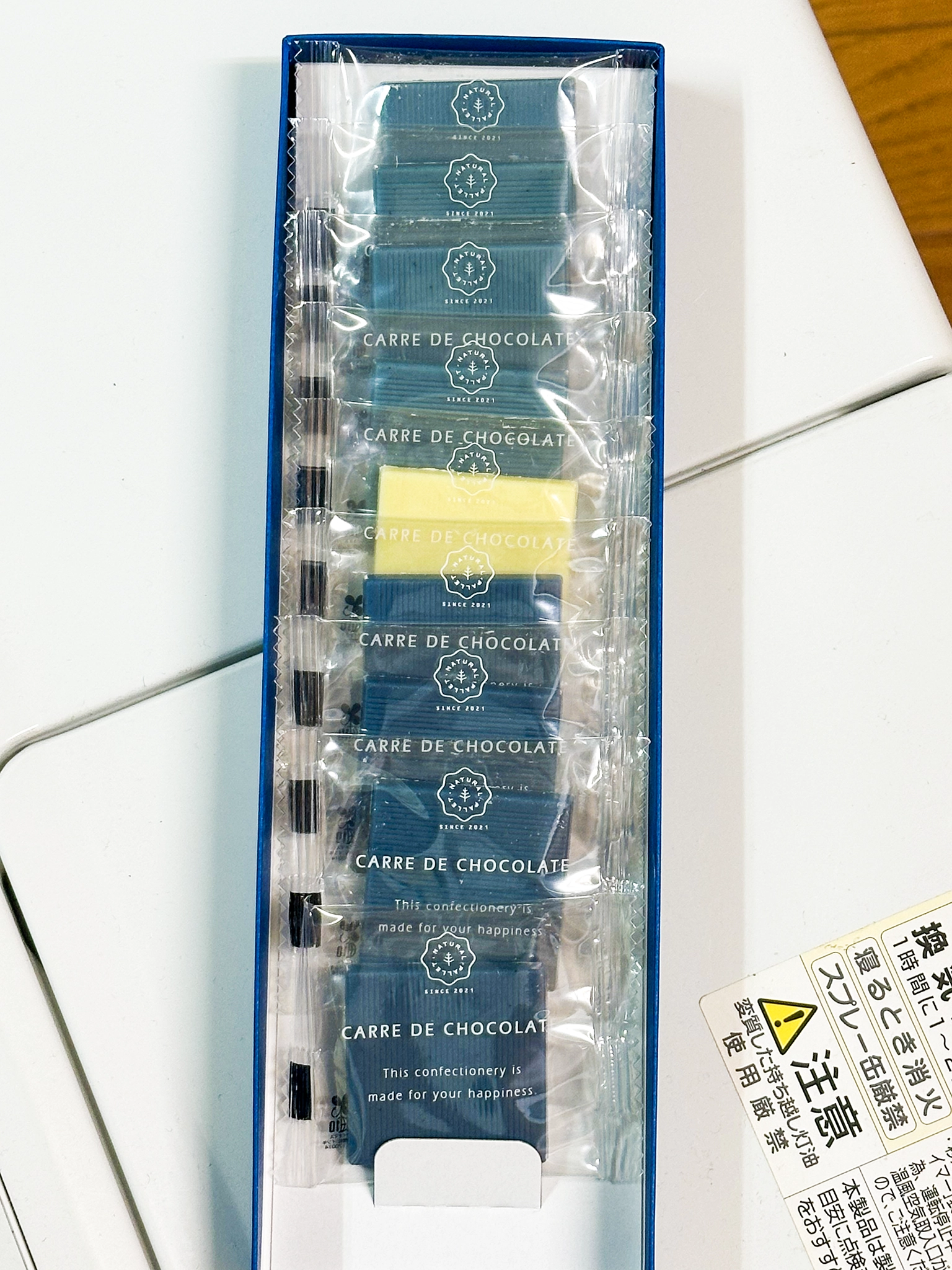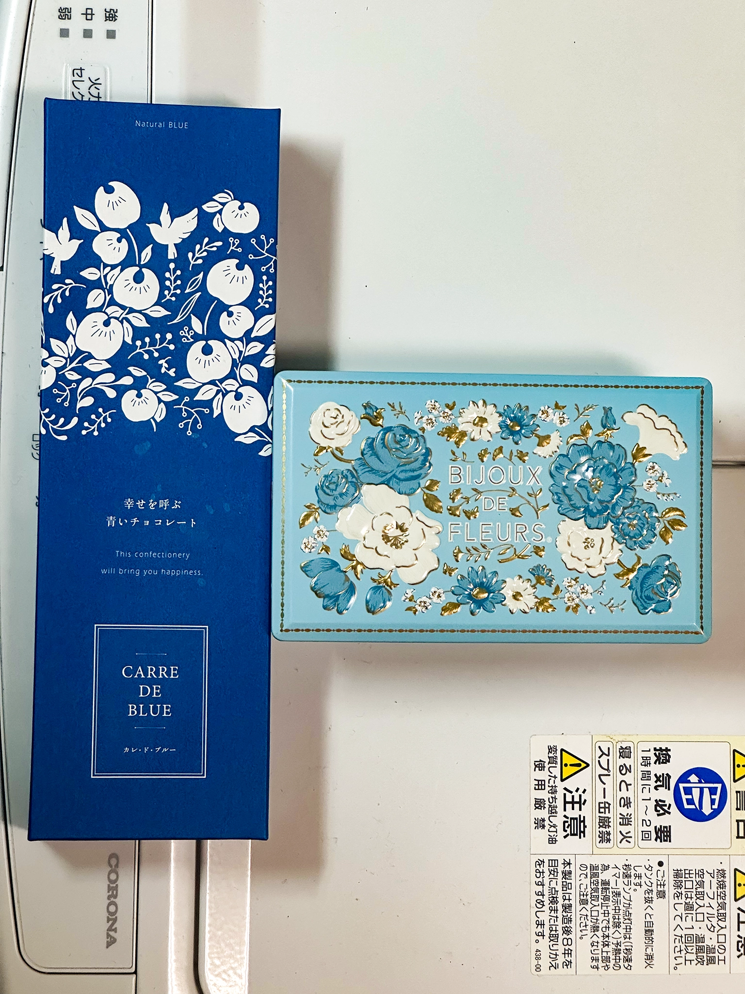 青いチョコレートは初めて見た。『カレ・ド・ブルー』っていう名前らしい。ちなみにこの青色はチョウマメから採られているらしい。