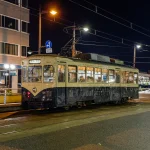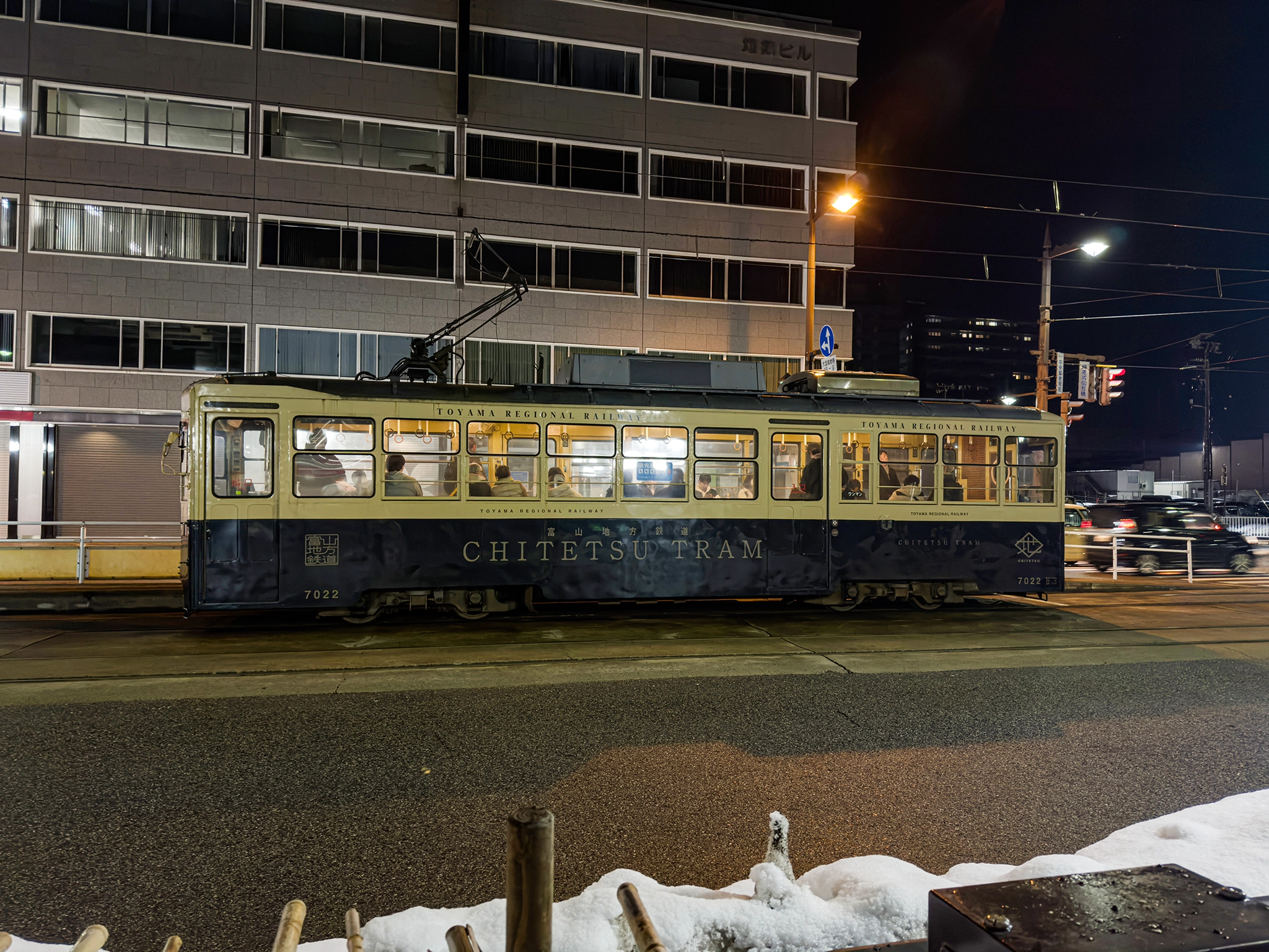 下の写真は駐車場に車を止めてから一心に行く途中で見た富山の路面電車デ 7000 形