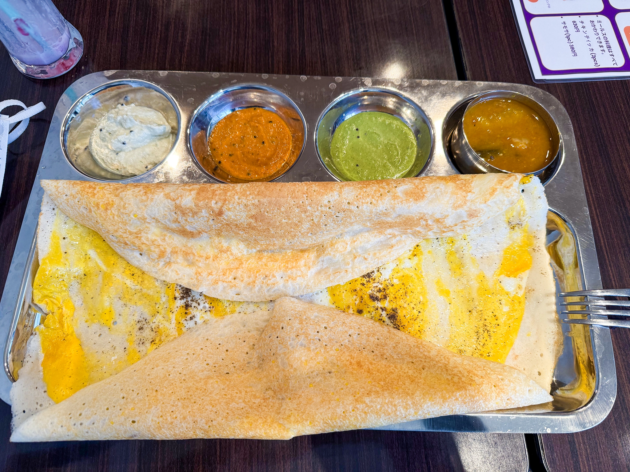 そしてカレー屋さんじゃない。いや、カレーなのかも知れないが、見た目がカレーじゃない。写真を見てもどんな料理なのかサッパリ想像つかない。ドーサと言う食べ物らしい。Wikipedia に載ってた。南インドの料理らしい。インド版クレープとでも言おうか? 米と豆をつかってつくるらしい。