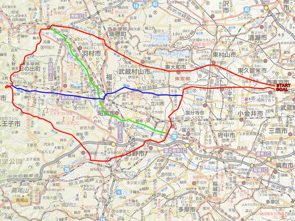 さらにもうちょっと山道を走ってみたいなら、そのまま赤いルートで八王子まで走る。
