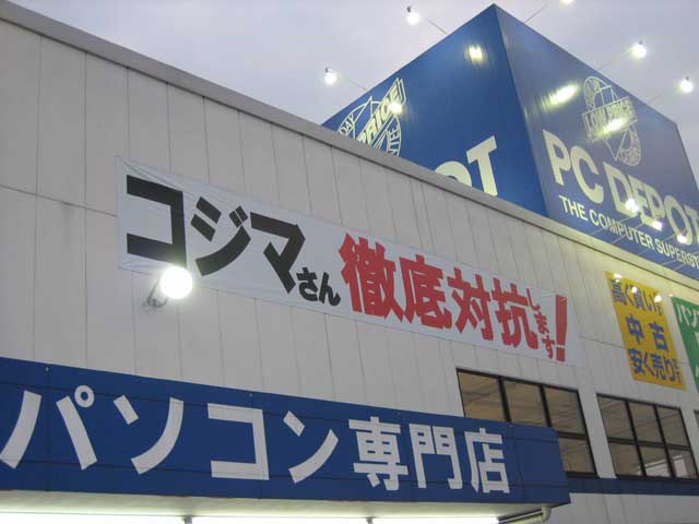 コジマの方は見てないのでわからないのですが、PC-DEPOT は最近苦戦しているという話を聞く。値段は個人的にはそんなに文句はないけどねぇ。秋葉より確実に高いけど、車で行けてしかも秋葉まで出る必要もなく、店員はいっさい話しかけてこないというこの店はボクは嫌いじゃない。