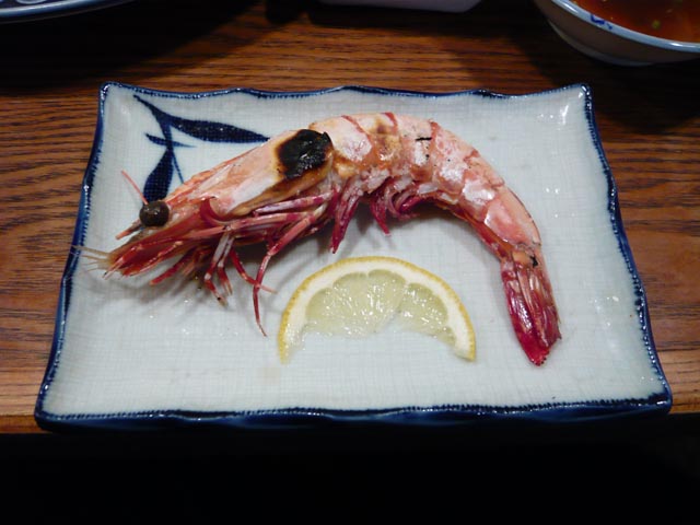 | ヒラメ鍋が煮立ったところ | 焼き物はエビ | |