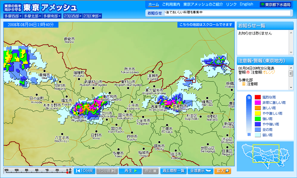 事務所で仕事をしていると、事務所の人から「今大雨で、関町で足止めされてる」という連絡が。雨だと? こっちは雲は多いけれど、青空が覗いているくらいの天気なんだけどなぁ、ってアメッシュを見てみたら……。