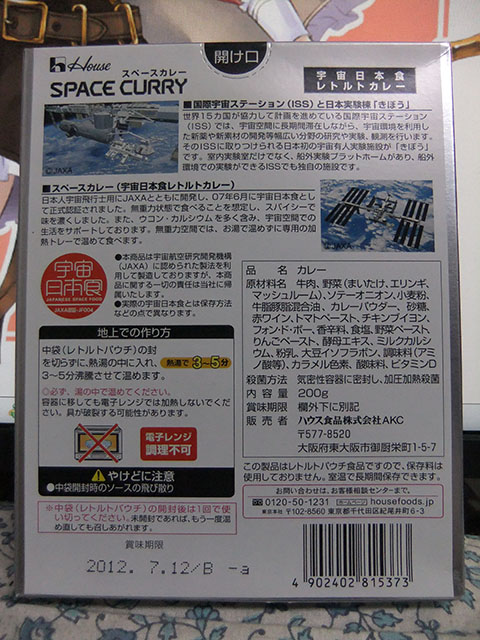 9/29 に行った科博で、ISS のカレーを買ってきた。他にもいろんな宇宙食があって、色々悩んだあげく、とりあえず無難なものを選んでしまった で、このレトルトのカレー、おもしろいことに、さらに出して電子レンジで温めるのは NG らしい。袋のままお湯で暖めろとのこと。 なので、一応マニュアル通りにしてみた。