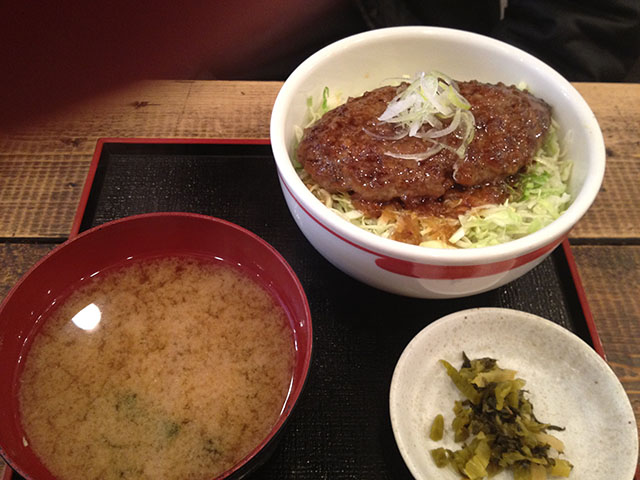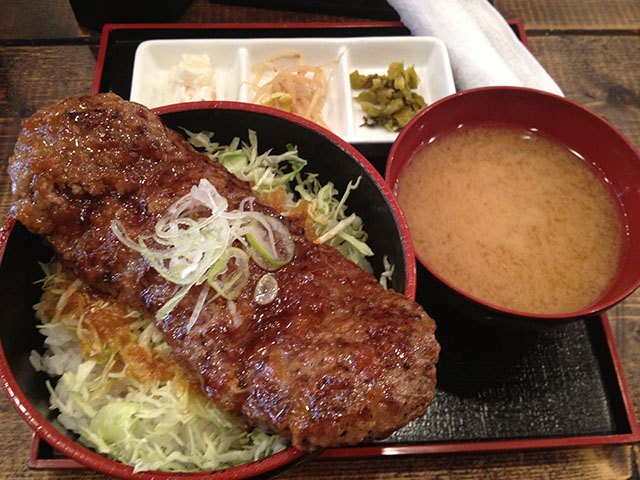 前に行ったとき、売り切れになっていたハンバーグ丼を食べに中村商店へ。行ってみると、ハンバーグ丼は売り切れてなかった。なのでさっそく注文。はみ出す奴があるらしいので、ボクはそちらを注文。 焼き加減はミディアムといった感じで、中がちょっと赤い。 肉汁が閉じ込められているのか、と思ったら、どっちかというと叩きに近かった(笑い すっごい油。 10 代 20 代ならきっと美味しく食べられるんだろうなぁ~。 不味くはないけど、おじさんにはきつかった(ぁ