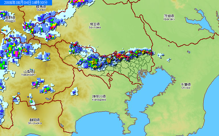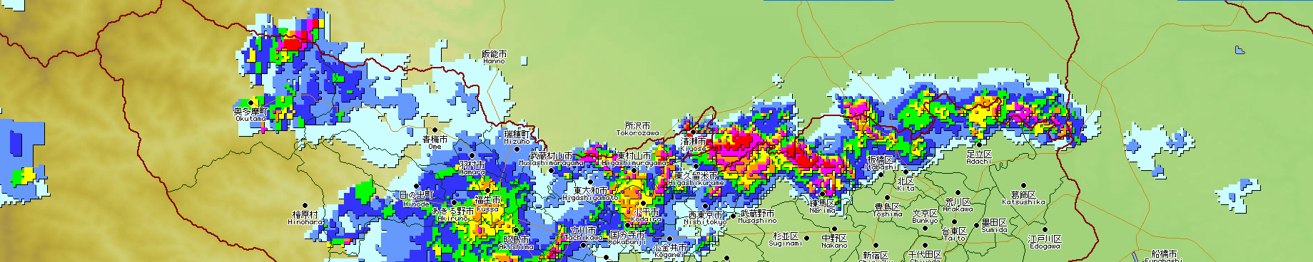 清瀬市の東側から練馬区一帯まで伸びている雨の強い所が、ちょうど東京で一番暑い場所と言われている部分。太平洋側からの海風が都市熱を運び、ここで貯まるのだぞうな。おそらく埼玉県側は若干標高が高くなっているのだろう。