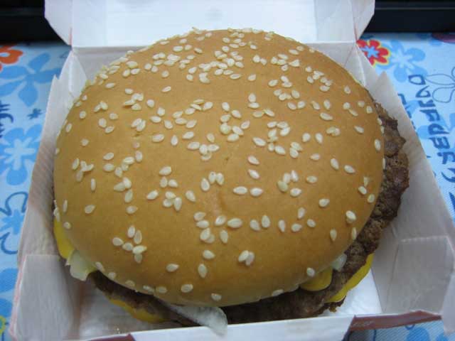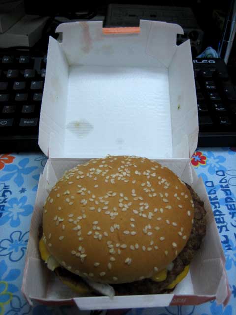 ところでクォーターパウンダーってことは、1/4 ポンド。1 ポンドは 453.6g? なんか D&D で 480g とか覚えてたんだけど、ボクの記憶違いらしい(汗)。というわけで 1/4 ポンドは 113.4g で、それがダブルだから 226.8g。いつもハンバーグとか 330g くらい食うから、大したことないじゃん……とか思ってしまったが、いいかげんそういう食生活からはおさらばしろよなどと思いつつ……orz
