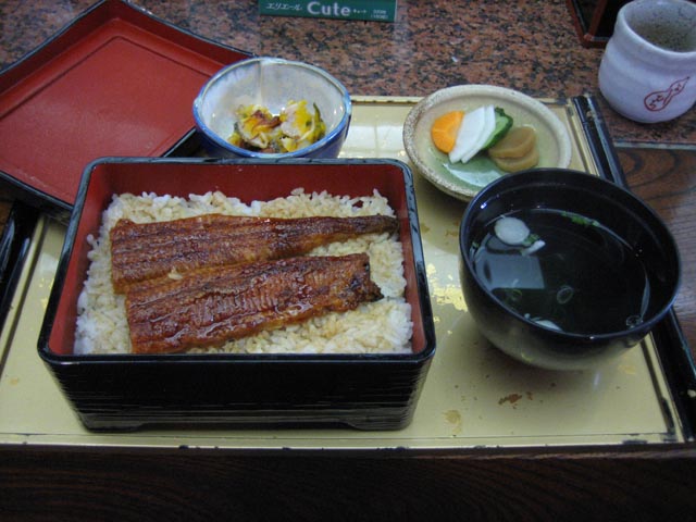 で、上のご飯の写真だけど、うな重はいまいち!(ぉぃ そばの方は、十割じゃなかったんだけど、っていうか十割があったのを普通のざるそばを頼んで気づいた……orz まぁそれはさておき、そばはちょっともっちりとした食感。そば粉と小麦粉と両方の味が独立してする、なかなか面白いそばだった。でも十割そば食べたかったなぁ。 あと面白かったのがつゆ。 しょっぱさは東京のと変わらないんだけど、甘かった。関西風ではないんだけど、ぴしっとした醤油のしょっぱさと、後からちょっと甘みが来る感じ。なかなかよかったと思う。