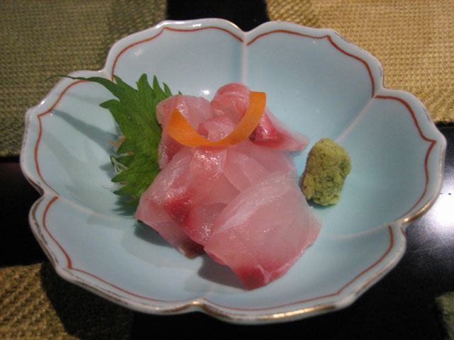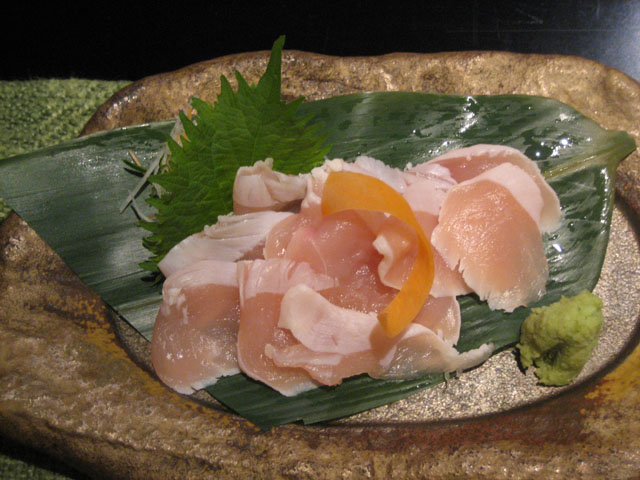 | 鯛の刺身 | 鳥わさ。醤油と山葵塩 | 鳥の刺身、アップ |