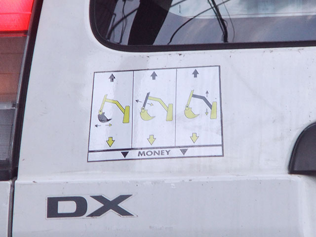 ところで下の写真は、録りのスタジオに行く途中に見つけたステッカー(?)。 どういう意味なんだろう?? ユンボの先はこんな感じで動きますよってこと? でも下の Money の意味が解らん。金を掘るぞってこと?? なんか不思議だったので、とりあえず写真に撮ってみた。