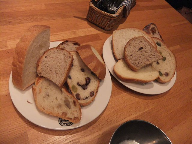 基本、パンとサラダが食べ放題のお店。 ただ、サンマルクのようにもってくるパンが常に焼きたてとは限らなかった。それを知らずに、最初に全種類を頼んでしまった……(汗)。最初にもってくるのは焼きたてではないのだ。 その後、焼きたてをもってくる。 焼きたてはすごく美味しかった! そうじゃない方もちゃんといろんな味がして美味しいは美味しいんだけど、やっぱり堅いしパサパサするし、う~ん……。