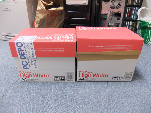 右の写真は右の箱が印刷が終わったもの。左の箱は 2500 枚入りの未開封の箱。今回のプロジェクトではこの箱 3 箱を使用した。けっこう重い。最初の 2 箱はクロネコさんにお願いしたけど、3 箱めは収録の際に自分で持っていった(汗)。