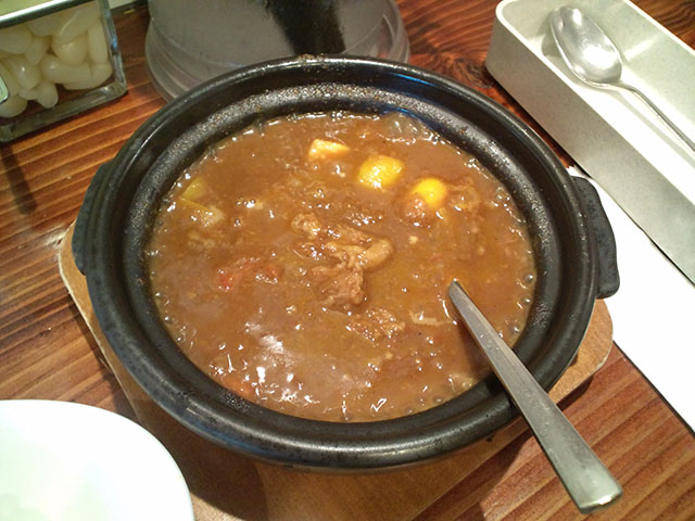 写真を見ると、ルーが泡立っているのが解ると思うけど、沸騰した状態で出てくる。当然黒い器はやけどに注意である。頼んだのは夏野菜牛すじカレー。結果から言うと、コク不足かなぁ。ルーがさらっとしているのはいいんだけど、ルーの味が物足りない。