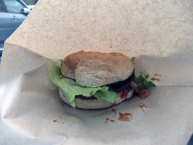 NTT はもうついちゃったし、13 時に別荘に行く必要もなくなったし、運転に嫌気は差しているし、起きてから何も食ってないしということで、群馬県の手前は上里 S.A. で朝食兼昼飯をとることにした。下の写真はそのとき食った和牛ハンバーガー。サービスエリアの屋台で売っていたものだし、たいしたことないに違いないと思ったのだが、これがなかなかみっしりと挽肉がつまっていて(つなぎ一切無し)、なかなか肉々しく、肉汁もしみていて美味しかった。かかっていたデミグラス・ソースが不味かったぐらい<ヲイ