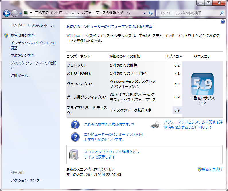 | Intel Core i5 650 | Intel H57 Express | CPU 内蔵 | 6.9 | 7.1 | 4.8 | 5.3 | 5.9 | 知人マシン |