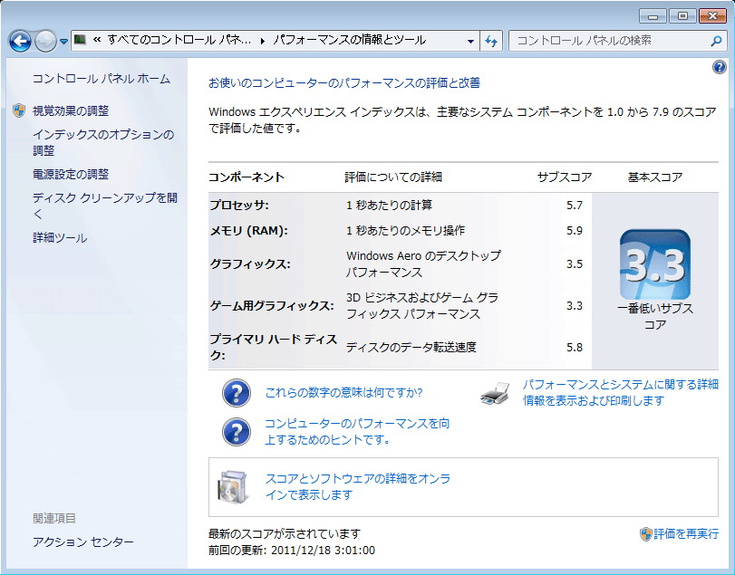 ただ、まだちゃんとチェックはしてないんだけど、起動がイマイチ遅いのよね。ひょっとして HDD が 5400rpm じゃないだろうなぁ? とか思いつつ……エクスペリエンス インデックスは以下の通り。