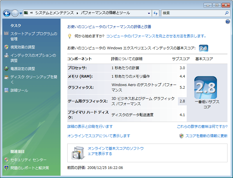 解せないのがグラフィクス。なんで Aero が 5.2 もあって DirectX は 2.8 しかないのよー。しかも Aero にすると「パフォーマンスが低下しています、Aero を切りますか?」みたいな表示が出るのよ。なんやねーん。