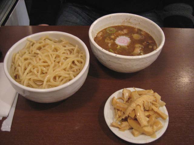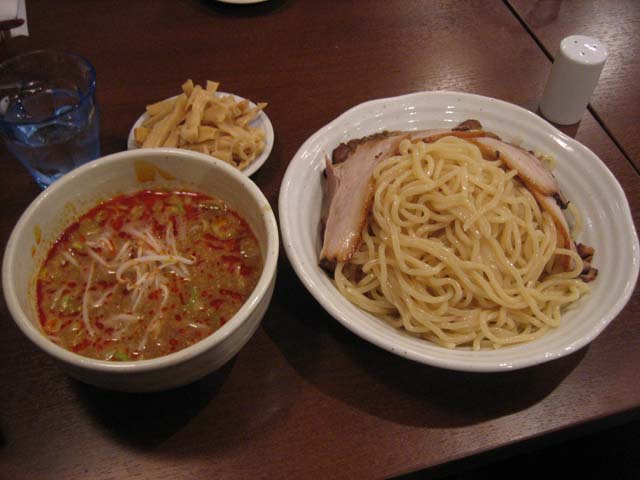 ボクがよく言っていたラーメン 大好(だいすき)の近くにつけ麺屋があると事務所の人が言うので、行ってきた。 麺屋はつがいというお店。 まぁ簡単に言っちゃうと、大勝軒みたいな感じ。 魚だし。魚粉一杯? ボクは胡麻坦丹つけ麺を頼んだので、普通のつけ麺の味はわからなかったんだけど、煮干し出汁のにおいは大勝軒より強かった。あと割りスープもそんな感じ。胡麻坦丹つけ麺は胡麻のどろっとしたスープにラー油を落としたもの。 不味くはないけど、味付けは普通かなぁ。担々麺を期待すると全然違う。胡麻味噌っぽい甘みが強くて、正直辛くはないのだ。