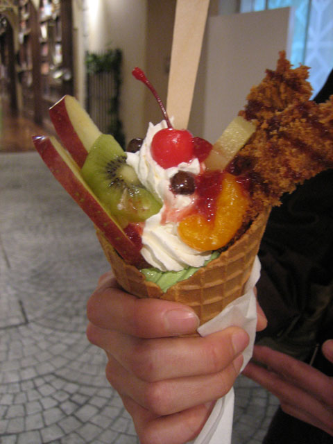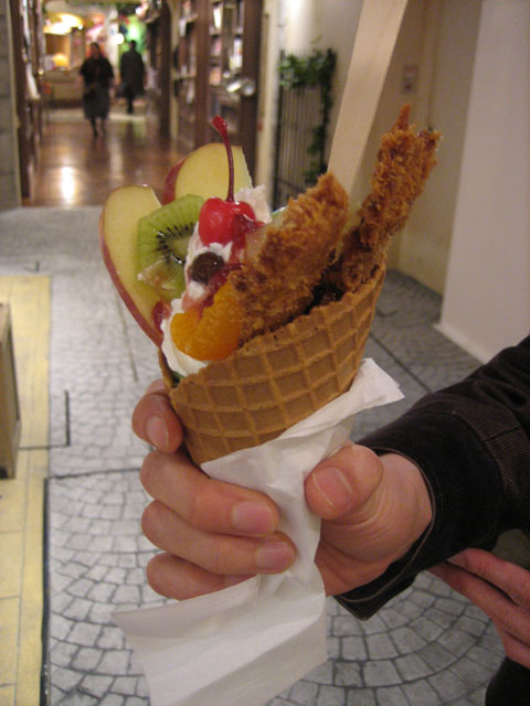 そして、ネタ的に「とんかつパフェ」と「チーズあんカツ」を注文。やっぱりここに来たら、食べなきゃダメでしょう。ちなみにとんかつパフェはストリート版。普通のとんかつパフェは大きなガラスの器に入っており、カツが 6 本も刺さっているヤツなんだけど、残念ながらすでに売り切れ。で、味の方だけれど、これが決して「うまい」わけじゃないが、「まずい」わけでもないところが不思議だった。