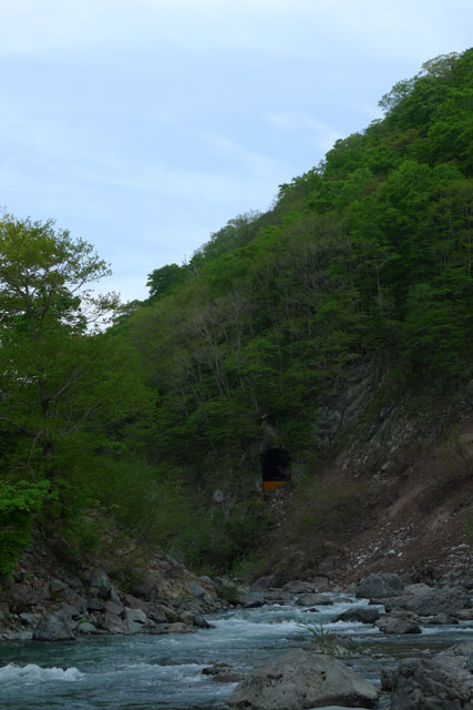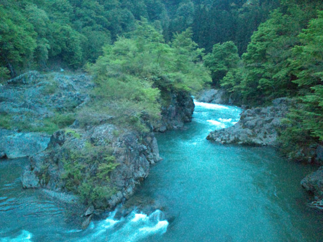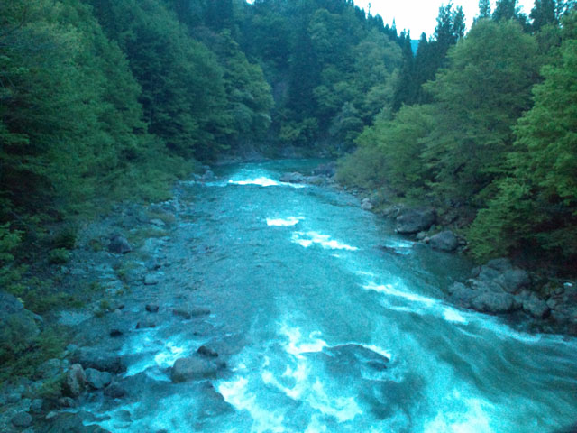 まず目指したのは秋山郷は切明温泉。ここは川の畔にお湯が沸いていて(55 度くらい)、川の水と混ぜて温度調節をしながら入る露天風呂である。もちろん無料(笑)。で、今週は二日間連続して大雨が降ったため、増水していてどんどん川の水が押し寄せるという状態に! しかし沸いているお湯は温度が高いため、身体半分が熱く、もう半分は冷たいというちぐはぐな入浴に。ちなみに川の水はどれくらい冷たいかというと、30 秒も手を入れていたらかじかんで手が動かなくなるほど。