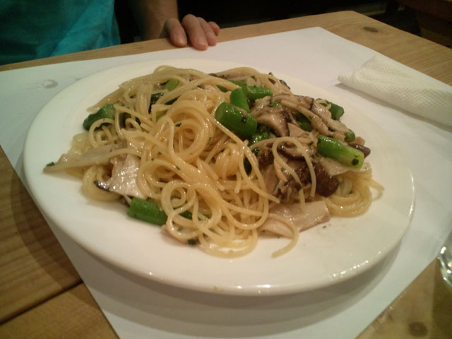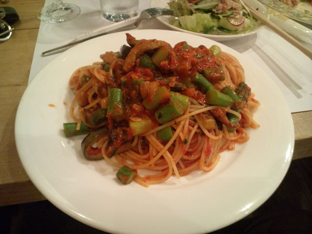 店の入り口茄子のトマトソースきのこのペペロンチーノ