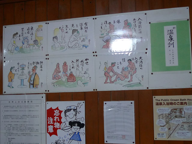 草津にも 17 ほどの無料で入れる共同浴場があるが、野沢のはどれも建物が立派。すげー! ただ 24 時間やっているわけではないらしい。残念!