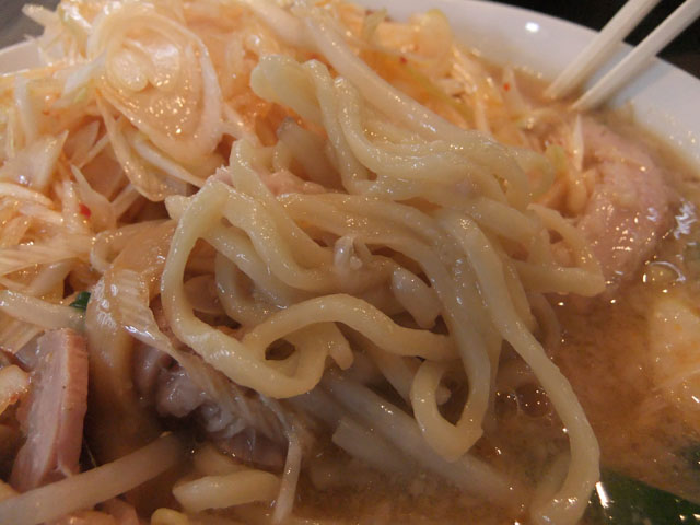 背脂たっぷりすぎる。喉に絡むぐらいタップリ(笑)。そして甘い。チャーシューも甘い。ただチャーシューは燻製っぽい香りがしていて、なかなか香ばしかった。あと味噌の悪く言うと臭みがあるんだけど、これがスープに合ってるような気がした。ただ個人的には中の下か中の中くらいじゃないかなぁ~~。