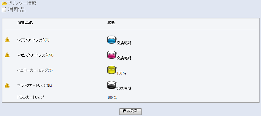 しまった、そういえばステータスぜんぜん見てなかったや、と思って、プリンタにアクセス*1すると、Y(イエロー)が空、C(シアン)が予備を用意しろとのこと。