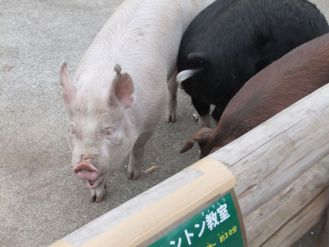 ブタとも触れあいたかったのだが、口蹄疫を心配してか、触れるのは NG とのことだった。餌を食べるのをひたすら眺めたりしていた。ブタは三頭いたわけだが、それぞれ毛の色が違った。一番食いしん坊がピンク、次が黒、そしてあきらめが早いのが栗だった。