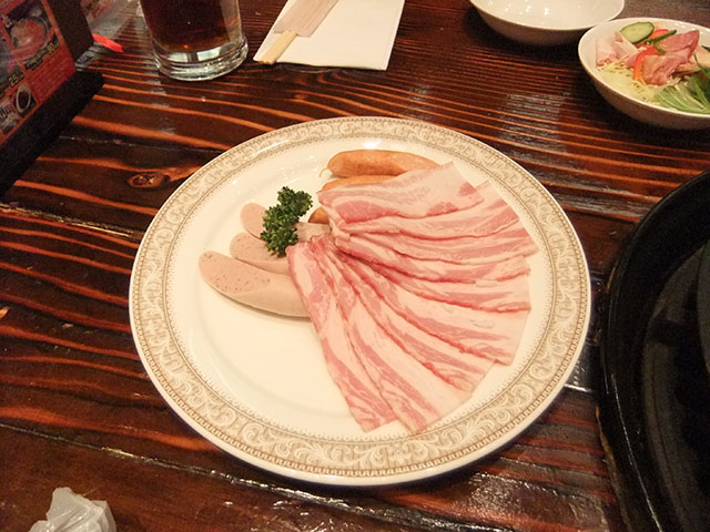 さて、さんざんブタを見たあとはいよいよ食う番である。ボクは「トンカツが美味しい」と聞かされていたので、すっかりトンカツを食べるつもりでいたのだが、行ってみるとそう言うワケではなくトンカツもあるが、メインはバーベキューとのことだった。要するにブタの焼き肉。一応、牛もある。というわけで、バーベキューコースを頼みつつ、単品でトンカツも頼む。