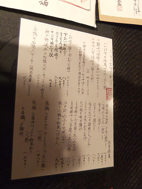 田舎(でんじゃ) 三鷹の和風創作料理屋![]() シナリオが一段落したので、晩ご飯を食べに行った。 しかしやはりなんと言ってもこの昭和のしかも 70 年代 60 年代を彷彿とさせる古い家の雰囲気がたまらない。規格(なんてものがあるのか解らないが)も明らかに古くて小さい。天井があまり高くない割に欄間があるため、ボクとかは鴨居に額がぶつかるほどである。 車を停める場所が店自体にはないので、近くのコインパーキングになってしまう。 ちなみに今回、写真は成功した方だと思う。部屋とか暗かったんだけど、ちゃんと色とか写ってる。よかったよかった。