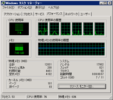 が複雑になり、メールの経路が 1 段増える。とりあえず新サーバの設定が一通り終わっても、様々なテストをしなければならないだろう(汗)。あと恐ろしいのが使用メモリである。下のタスク マネージャのスクリーン・ショットは新物理サーバのものであるが、使用メモリ、7.4GB ……orz。このサーバは 4GB の DDR3 が 2 枚挿してあったのだが、急遽、余っていた 2GB の DDR3 メモリを挿して 12GB にしてなんとか難を逃れている(汗)。