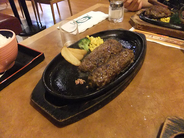 みっしりと肉が詰まっていて、ステーキとは食感は違うけど、肉食ってるって感じがしてすごくいい。しかも肉汁がステーキよりも閉じこもっている感じがした。うまかった、ハンバーグ。ステーキも、見た目がちょっと……っておもったんだけどすっげーやわらかかった!