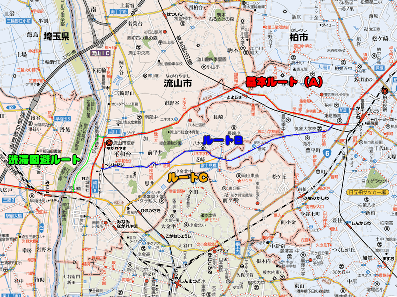 そこでいろいろ試しているのだが、柏で流山の方に折れる。流山への出方は基本 3 種類あってルート C が時間的にも距離的にも一番近い。緑の「渋滞回避ルート」は基本ルート(A)を使った場合に、江戸川沿いに出た方が速い場合である。