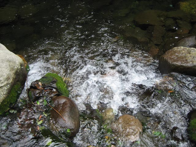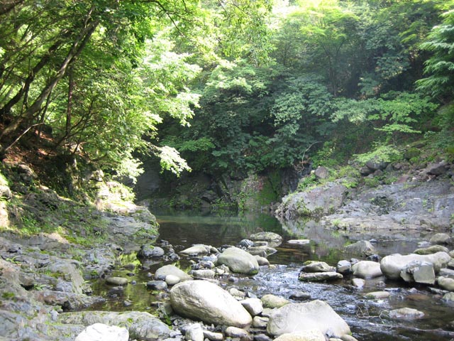 ここはダムの上流にあたる川なので(もっともその上にも更に小さなダムはあるが)、石がかなり大きい。水は結構澄んでいて、なんといっても涼しいのがいい。また岩肌から水がしみ出してきていて、なかなか風情がある。