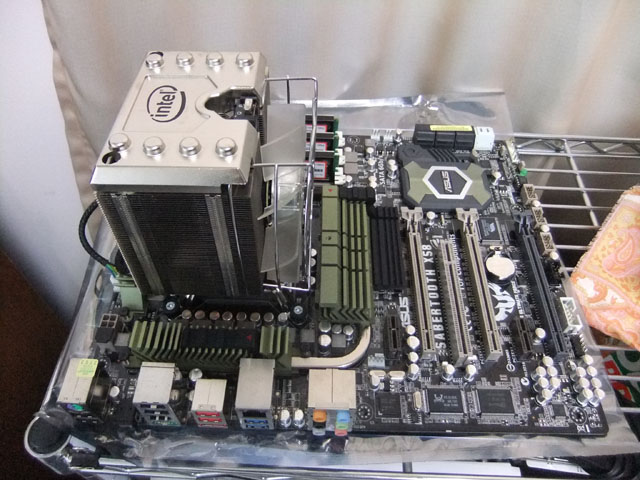 右の写真は無残にも引っぺがされた Core i7 マザー(笑)。CPU クーラーがデカすぎて、マザーの箱に入らないので、とりあえず放置!<ヲイ