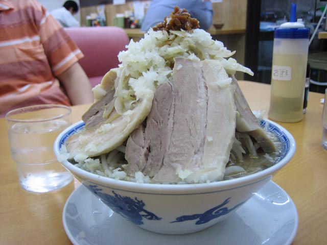 竜ヶ崎にある「角(かど)ふじ」というラーメン屋に行ってきた。 結論から言うと、(ラーメン二郎+大勝軒)÷2って感じ。 しっかり出汁の取れたラーメン二郎とも言う(笑)。 大勝軒と何の関係があるのか解らないが、東池袋の大勝軒に関する記事がいっぱい張ってあった。 しかしここは麺がおもしろい。 下の写真を見れば解る通り、細麺で普通に二郎の太さがある。 太麺が下のつけ麺のほう。かなり太くて縮れている。 太くて縮れていると、すんごくスープと絡むのよね。しょっぱかった(汗)。 スープは煮干しだしに鰹の出汁粉末がそのまま入っている感じ。味的にはかなり大味。でもそれが許せる具と麺なのよね。そういう意味ではバランスがとれている。