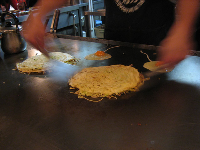 広島風お好み焼き(って言うと、広島の人は怒るんだけどね)のお店はまだまだ東京には少ないと思うんだよね。そのせいもあってか、お店はかなり混んでいた。けっこう待っていた客もいた。ボクらは龍英が予約を取ってくれたこともあり、すぐに座れた。