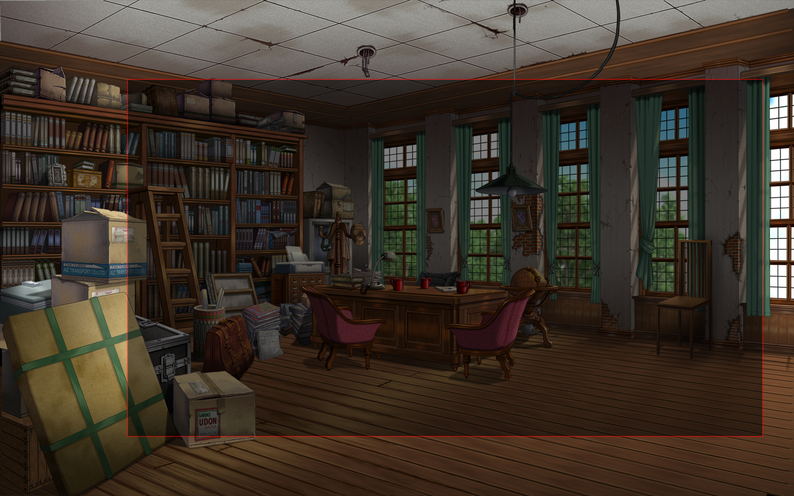 さて、ここで天気と季節の登場だ。通常、エロゲでは天気をあまり意識することなく作ることが多い。なのでエロゲでは常に晴れだったりするんだけど(笑)。イベントで雨のイベントがある場合は、そのシーンに必要な背景だけ雨を作ったりする。 最後にモブ。最近のエロゲではモブって描いてるの少ないような気がするけど、モブがあるとぐっと現実感が増すので、余裕があるならモブを置くとよいかも知れない。 で、これらの項目をすべて重ね合わせていくと、とんでもない差分の量になる。ちょっと整理してみよう。 まず、時間差分で 4 種類(昼夕夜深)。さらに季節が夏と秋があったらこれで 8 種類(夏の昼夕夜深、秋の昼夕夜深)。晴れと雨があったら 16 種類!(夏で晴れの昼夕夜深、夏で雨の昼夕夜深、秋で晴れの昼夕夜深、秋で雨の昼夕夜深) ただ、一枚、晴れの通常を描けばそこからあとは CG だけで作れるという利点もあるけどね。 で、これをファイル名にどう反映するか? BG[モブ番号][季節番号][場所番号2桁][時間差分][天気番号] モブ番号は 0 がモブ有り、1 がモブなし。季節番号は 0 = 春、1 = 夏、2 = 秋、3 = 冬、場所番号は単純に表のファイル名の番号、時間差分は何も付いてないのが昼、e = 夕方、n = 夜、m= 深夜、天気番号が何も付いてないのが晴れ、1 = 曇り、2= 小雨、3 = 雨、4 = 雪、といった感じ。 BG1201e -> モブ有り、秋、夕方、晴れの 01 番の背景 まー、これはフル機能つけた場合の話であって、天気も季節もモブも全部いれられることなんてそうないので、だいたい数字の部分は 3 桁や 2 桁ですむことがほとんどである。 余談さて、最後に余談。以前作った「翼をください さらに背景の裏話。背景ってのは、ゲームの画面より大きく用意することが多い。下の例だと、赤枠の中がゲーム画面のサイズで、位置はデフォルト位置(何も指定をせずに背景を表示すると、この赤枠の部分が表示されるようになっている)。 これはどうしてかというと、画面を揺らしたり、あと画面に入りきらないくらい立ち絵を並べた時に背景もスクロールさせて表現したりするために、大きめに作ってあるのである。 なんだかまとまりのない話になってしまった(汗)。まぁ、意外と背景ひとつとっても、いろいろと試行錯誤があるというところだけでも理解してもらえるとありがたい限りである。まぁでも、3D のゲームやアクション・ゲームとかより仕掛けや構造は圧倒的に単純である。