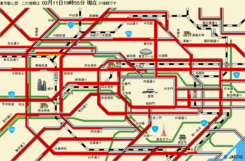 地震発生直後は古い家に住む母と連絡をとり、あとはネットで済ませた。携帯電話は 18 時頃まで不通で、正直使い物にならなかったが、ドコモ間では通じるようであり、18 時までにボクに電話をかけてきた人が何人かいた。固定電話は(事務所は光電話であるが)利用可能で、このあと打ち合わせ予定のあったクライアント各社には固定電話で連絡し、中止を確認した。