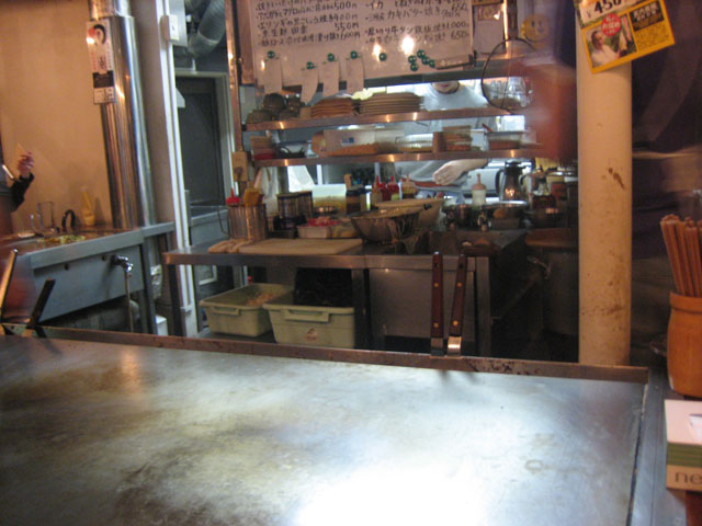 お好み焼きそのもののメニューは少なく、基本的にそばかうどん入りか、ネギ焼きかって感じ。それ以外は鉄板焼き屋を兼ねており、イカや豚カルビ、牛タンなどなど、鉄板焼きのメニューが並ぶ。ボクらが頼んだのは「そば」「うどん」「ねぎやき」の三種類。