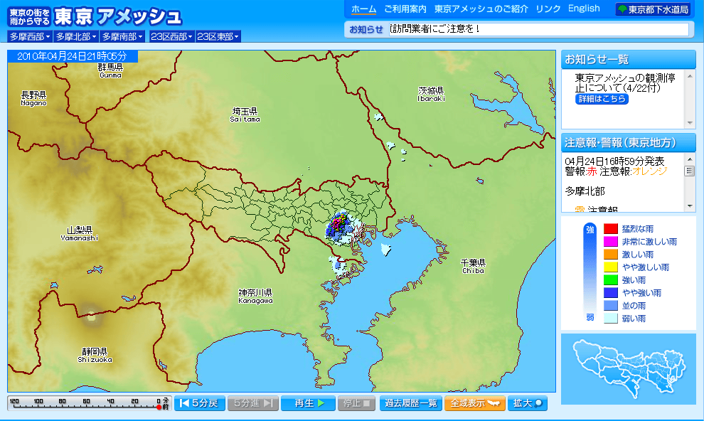 昨日、会津から帰る前に東京の天気を調べていたんだけど、21 時頃のアメッシュ画像が!!