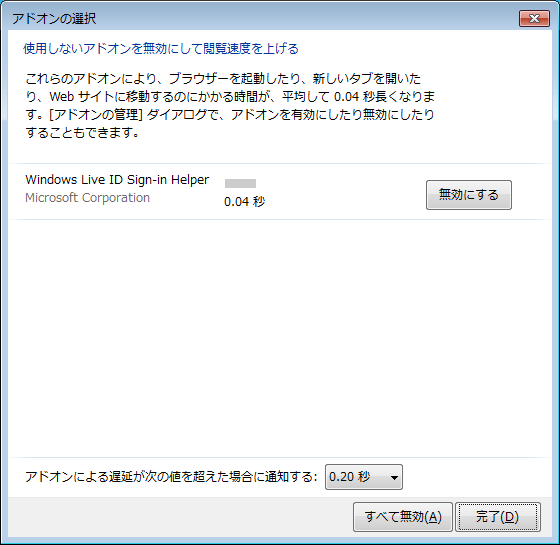 おもしろいのが、ノート PC で起動時に出たダイアログ。なんと、IE9 は起動時間を測定し、起動に時間がかかったプラグインをアナウンスしてくれるのである(他のブラウザを使ったことがないので、Firefox とかには昔からあったのかも知れないが)。しかしここまでする必要があるのだろうかと思いつつ(汗)。