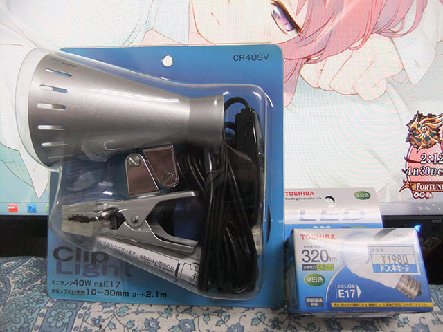 資料本がヤバいことになっている。 ボクのシナリオが進まない理由の一つに、資料本を読めていないというのがある。戦争の仕方とか、あとヨーロッパの町民や農民の生活についての資料を買ってあるにも関わらず、全然読めていないので、そういうシーンのシナリオが一切書けず、なんだかんだで 1 ヶ月以上が経ってしまっているのだ!! これはいけない。 というわけで、寝る前に本を必ず読むようにすることにした。 今はベッドに入っても眠くなるまでノート PC で仕事をしていたのだけれど、それをやめ、ベッドに入ったら本を読むことにするのである。がしかし、ライトがない。ノート PC は液晶ディスプレイが光るから暗くても作業が出来るが、本はそう言うワケにはいかない。 というわけでライトを買うことにしたのだが、電力不足が問題になっている時期、電球は問題だろう(とはいえ、夜使うから電気は余っているとは思うが)。 LED のスタンドとかないのかなーと思ってドンキホーテに行くも、そんなものはなかった。そこで、電球のスタンドなんだけど、電球部分を LED にすればいいやと思いつく。で買ってきたんだけど、スタンドが 1000 円で、LED 電球が 2000 円ですよ。電球、スタンドの倍かよー!!