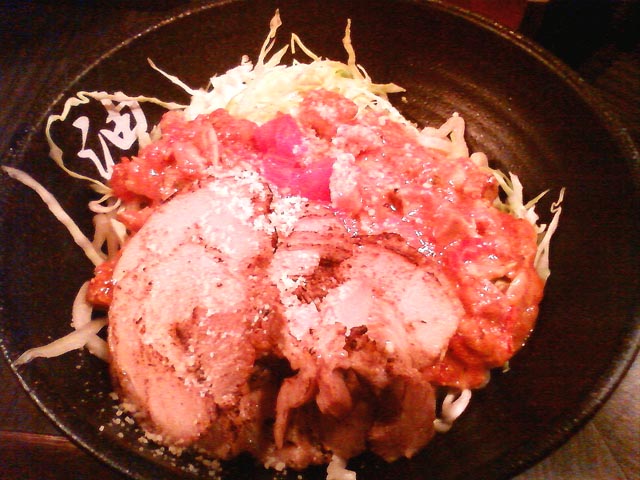 案の定、醤油をお湯で割ったようなコクも出汁も何もないスープに、背脂たっぷり。これで甘みが増している。そして太めの堅いもさもさした麺。ただ思ったのがラーメン二郎より塩気が強いかもしれない。しかも意外に侮れないのが、タマネギ。