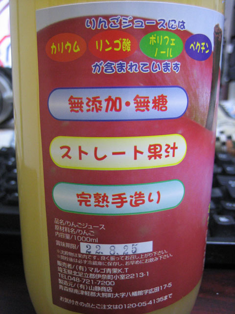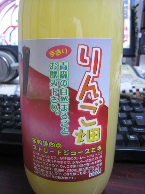 自室で仕事をしていたら、親がリンゴジュースを売りに来ているのだが、買うかと言われた。何のこっちゃと思ったら、津軽からわざわざリンゴジュースを売りに東京へ行商に来たらしい。まぁホントかどうかは知らないが、濃縮還元じゃない果汁 100% ジュースは欲しいところだったので 2 本ほど買ってみた。1L で 1000 円。いいお値段だなぁ。