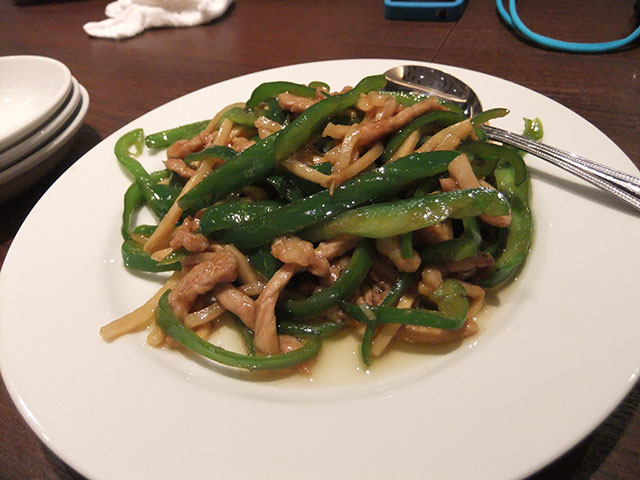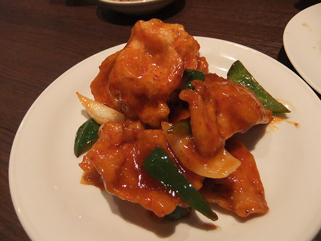 それよりも味付けがけっこうボク好み。割と本場の麻辣 ( マーラー ) 味で、山椒とは違う喉を刺激する気持ちのいい辛さ。好きなのよねぇ。他には青椒肉絲と鶏の唐揚げの甘酢がけを頼んだ。どちらも味は濃いが、塩分は思ったほどでもなかった。