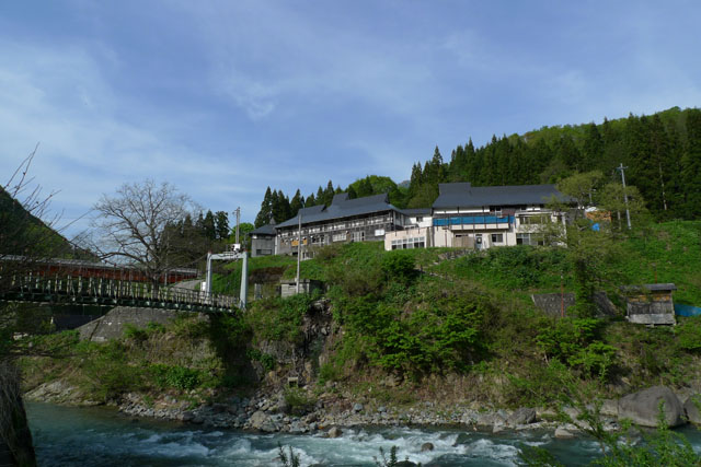 他にも人がいたので全体像は撮れなかったのだが、そこそこ絵になる写真が撮れた。一枚目の写真、手前の池みたいになっているところが川をせき止めて作った湯船である。つまり、お湯なのだ。奥に見える建物は切明温泉の旅館『雄川閣』である。またその雄川閣と手前の池の間に川が流れている。