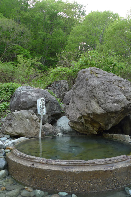 秋山郷の終点(?)にある切明温泉というところへ。ここは川から温泉が湧いていて、うまいこと川をせき止めて湯船を作るのだ。温泉自体は 50 ~ 70 ℃あるのでお湯だけせき止めたのではとても熱い。なので川の水と混ぜるのがコツだ(笑)。